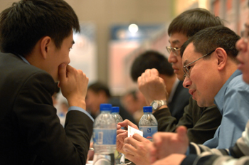 一名留學(xué)德國的創(chuàng)業(yè)項(xiàng)目負(fù)責(zé)人(右)在洽談會(huì)現(xiàn)場向國內(nèi)一家企業(yè)代表推介帶來的芯片開發(fā)技術(shù)項(xiàng)目。 新華社記者 黃宗治