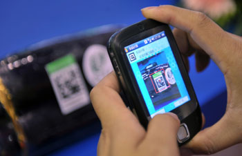 海南省加緊建設(shè)瓜菜質(zhì)量監(jiān)管物聯(lián)網(wǎng),圖為工作人員正在演示用手機(jī)掃描瓜菜上的二維碼標(biāo)貼。記者 郭程