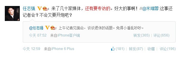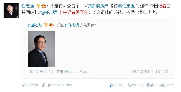 據(jù)南方都市報(bào)消息,昨晚地產(chǎn)商潘石屹發(fā)微博稱:“歡慶@任志強(qiáng)光榮退休!”隨后,地產(chǎn)大佬、華遠(yuǎn)地產(chǎn)董事長任志強(qiáng)通過微博回應(yīng),公司已公告新的董事人選,還有一個(gè)月。關(guān)于退休生活,他說,“咱也準(zhǔn)備改行弄點(diǎn)學(xué)術(shù)研究,當(dāng)個(gè)啥作家”。