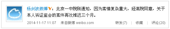 11月17日,楊劍波發(fā)布微博稱,“北京一中院剛通知,因?yàn)榘盖閺?fù)雜重大,經(jīng)高院同意,關(guān)于本人訴證監(jiān)會(huì)的案件再次推遲三個(gè)月。”據(jù)知,這已經(jīng)是北京一中院第三次下達(dá)延期宣判的通知。