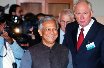 “實(shí)際上,我想踐行這樣一種機(jī)制,就是讓那些有能力的窮人得到這筆錢,通過某種方式,給他們貸款來幫助他們。而這樣的一種機(jī)制應(yīng)該說是‘放之四海而皆準(zhǔn)’的,無論是在孟加拉,在中國,在危地馬拉,還是在美國等等,都一樣。”訪談結(jié)束時(shí),尤努斯這樣告訴記者。