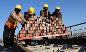 7月22日,中鐵九局鐵路建設(shè)者在額哈鐵路建設(shè)工地搬運(yùn)托軌滑輪。額哈鐵路是國家“一帶一路”戰(zhàn)略和《中長期鐵路規(guī)劃網(wǎng)》重點(diǎn)工程,預(yù)計(jì)年底建成投入運(yùn)營。 新華社發(fā)(蔡增樂攝) |