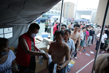 ??? 8月13日,應(yīng)急疏散的群眾在天津濱海新區(qū)開發(fā)區(qū)第二小學(xué)安置點領(lǐng)取生活用品。記者 才揚(yáng) 攝 |