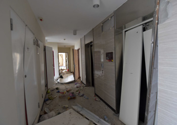 8月13日拍攝的爆炸地點附近的萬科清水藍(lán)灣小區(qū)受損情況,電梯和門已經(jīng)被毀壞。 新華社記者 岳月偉/攝 |