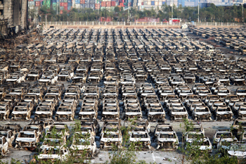8月13日,在天津海濱爆炸現(xiàn)場,數(shù)千輛車輛被燒毀,損失巨大。 新華社記者 才揚/攝 |