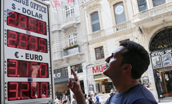 8月18日,在土耳其伊斯坦布爾,一名男子注視匯率顯示屏。土耳其里拉對(duì)美元匯率18日再創(chuàng)歷史新低,跌至1美元兌換2.906里拉。自今年初迄今,里拉對(duì)美元貶值約20%,為貶值最嚴(yán)重的新興市場(chǎng)貨幣之一。同日,土耳其中央銀行決定,維持今年5月以來(lái)的利率水平。 新華社/歐新中文 |