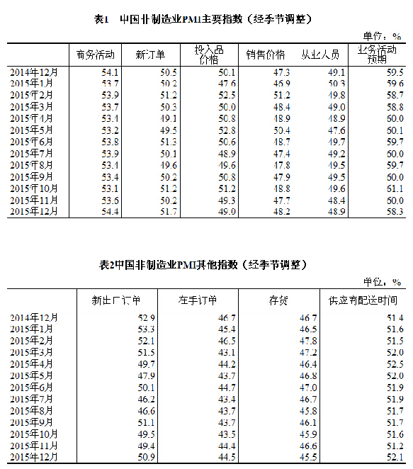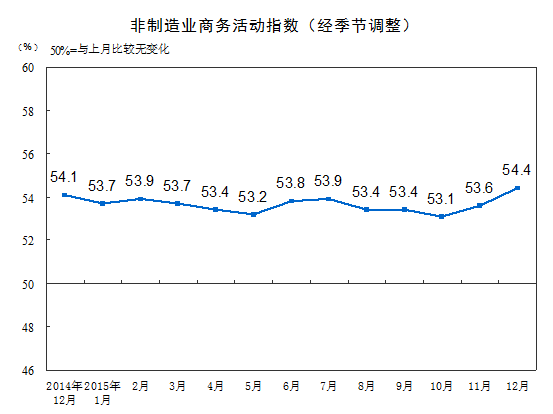 2015年12月份,中國非制造業(yè)商務(wù)活動指數(shù)為54.4%,比上月上升0.8個百分點,升至2015年內(nèi)高點,擴張動力較為強勁。