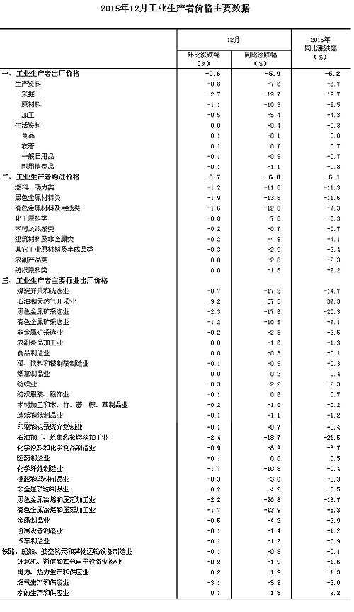 2015年12月份,全國(guó)工業(yè)生產(chǎn)者出廠價(jià)格環(huán)比下降0.6%,同比下降5.9%。工業(yè)生產(chǎn)者購(gòu)進(jìn)價(jià)格環(huán)比下降0.7%,同比下降6.8%。2015年,工業(yè)生產(chǎn)者出廠價(jià)格同比下降5.2%,工業(yè)生產(chǎn)者購(gòu)進(jìn)價(jià)格同比下降6.1%。