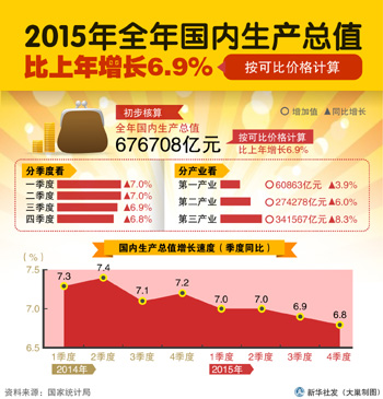 國家統(tǒng)計局19日公布2015年國民經(jīng)濟運行情況。根據(jù)初步核算,全年國內(nèi)生產(chǎn)總值676708億元,按可比價格計算,比上年增長6.9%,增速創(chuàng)下25年新低。