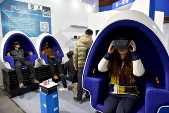 觀眾在科技體驗展上體驗虛擬現(xiàn)實產(chǎn)品。 新華社記者 李鑫/攝? |