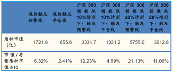 圖表2:壓力測(cè)試結(jié)果,20%跌幅下有近三成質(zhì)押市值觸及預(yù)警線? |