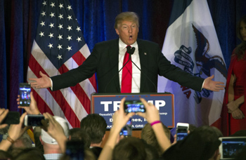 2月1日,美國共和黨總統(tǒng)候選人唐納德·特朗普在美國艾奧瓦州錫達拉皮茲參加競選活動。美國中西部的艾奧瓦州1日晚舉行2016年總統(tǒng)選舉首場黨內(nèi)預(yù)選,打響今年美國總統(tǒng)大選的第一槍。 新華社/歐新中文? |