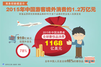 火爆的出境游帶動了海外消費。國家旅游局?jǐn)?shù)據(jù)顯示,2015年,中國出境旅游達(dá)1.2億人次,出境人次和消費均列世界第一。商務(wù)部數(shù)據(jù)顯示,2015年中國游客在境外消費約1.2萬億元,繼續(xù)保持世界主要旅游消費群體稱號。
