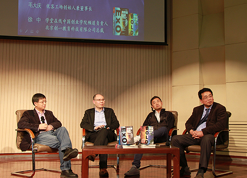 參會嘉賓有教育部長江學者特聘教授陳勁、優(yōu)客工場創(chuàng)始人兼董事長毛大慶、北京大學新聞與傳播學院教授胡泳和北京創(chuàng)一教育科技有限公司總裁徐中。