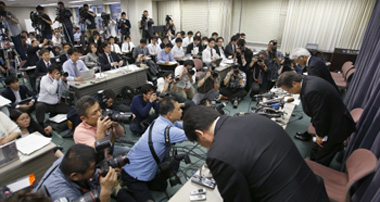 4月26日,在日本東京,日本三菱汽車公司社長(zhǎng)相川哲郎(右中)出席記者會(huì)時(shí)鞠躬。三菱汽車上周承認(rèn),該公司有四款微型汽車在燃油經(jīng)濟(jì)性測(cè)試中存在違規(guī)操作,以美化排放水平。 新華社/美聯(lián)? |