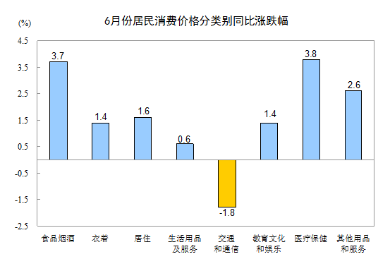 6月份,其他七大類價(jià)格同比六漲一降。其中,醫(yī)療保健、其他用品和服務(wù)、居住、衣著、教育文化和娛樂(lè)、生活用品及服務(wù)價(jià)格分別上漲3.8%、2.6%、1.6%、1.4%、1.4%、0.6%;交通和通信價(jià)格下降1.8%。