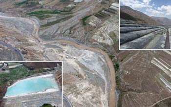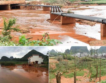 云南省昆明市東川區(qū)的小江和直接建在河谷里的兩座尾礦庫近景。金沙江一級支流——小江,2008年以前的尾砂直排和特殊地質(zhì)地貌,使小江成為一條泥沙河,每年有超過3000萬噸泥沙經(jīng)小江注入金沙江。記者 周華/攝 |