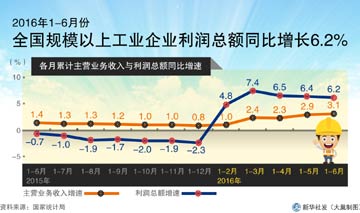 國(guó)家統(tǒng)計(jì)局7月27日發(fā)布的工業(yè)企業(yè)財(cái)務(wù)數(shù)據(jù)顯示,1至6月份,規(guī)模以上工業(yè)企業(yè)利潤(rùn)同比增長(zhǎng)6.2%,增速比1至5月份回落0.2個(gè)百分點(diǎn),主要受3月份較高增長(zhǎng)的影響。其中,6月份利潤(rùn)同比增長(zhǎng)5.1%,增速比5月份加快1.4個(gè)百分點(diǎn)。專家表示,6月份工業(yè)企業(yè)利潤(rùn)增長(zhǎng)加快,主要受工業(yè)生產(chǎn)和銷售增長(zhǎng)有所加快,產(chǎn)品價(jià)格降幅繼續(xù)收窄影響,工業(yè)企業(yè)降本減負(fù)效果顯現(xiàn),庫存壓力繼續(xù)減緩。但是,制約企業(yè)效益向好的不利因素仍然存在,目前的利潤(rùn)增長(zhǎng)不夠均衡,新增利潤(rùn)集中于少數(shù)行業(yè),未來整體工業(yè)生產(chǎn)難言樂觀。