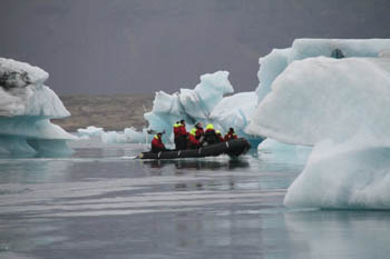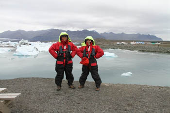 靠近冰湖時,會有明顯的降溫,風也變得更刺骨。好在游船公司都會給每位游客套上一身超級防風保暖的連體衣。由于沒有提前預(yù)訂,幸運的我們居然趕上了最后一班游船。選擇游船也有講究,一般來說大船穩(wěn),小船也就是沖鋒艇快,而且靈活,可以更加深入地穿行在狹窄的大塊浮冰中間,這點經(jīng)驗日后在觀鯨時也能用上。