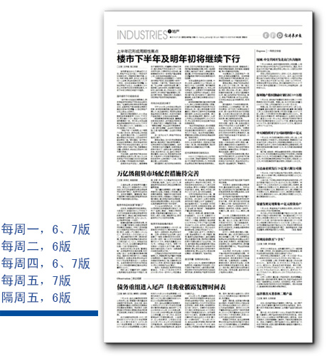 周一 6版:能源 7版:環(huán)保 周二 6版:物流 周三(隔周) 6版:3C 7版:E商 周四 6版:汽車 7版:地產(chǎn) 周五 6版:互聯(lián)網(wǎng)+ 7版:健康