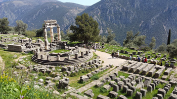 在距雅典150公里的帕那索斯深山里,有一處世界聞名的著名古跡,被稱為“地球的肚臍”的德爾菲。這里主要由阿波羅太陽神廟、雅典女神廟、劇場、體育訓(xùn)練場和運動場組成,其中最有名的是古代希臘象征光明和青春并且主管音樂、詩歌及醫(yī)藥、畜牧的太陽神阿波羅的神廟。古希臘人認(rèn)為,德爾菲是地球的中心,是“地球的肚臍”。宙斯為了確定地球的中心在哪里,從地球的兩極放出兩只神鷹相對而飛。兩只鷹在德爾菲相會,宙斯斷定這里是地球的中心,于是將一塊圓形石頭放在德爾菲,作為標(biāo)志。如今這塊石頭就珍藏在德爾菲博物館里。