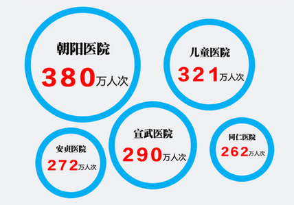 ▲這是北京部分三甲醫(yī)院2015年門急診量。這意味著一些醫(yī)院每天要有超過1萬名患者前往就診。