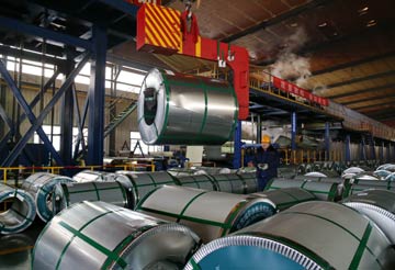 | ?11月12日,工人在河北省遷安市一個(gè)鋼鐵深加工企業(yè)的彩色鋼板生產(chǎn)線上工作。記者 楊世堯/攝 |
