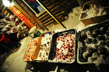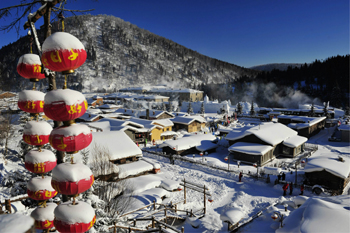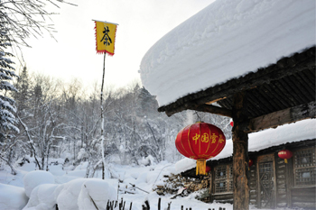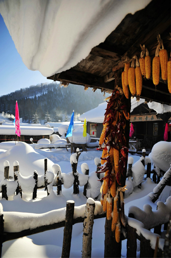 雪鄉(xiāng)的雪美得奇特,美得讓人不敢相信,真像童話故事和畫片中所描述的那樣,厚厚的白雪覆蓋的小村子連綿起伏,涌起像蘑菇一樣的座座小房子,在房頂和拌子垛上卷起一層層雪檐,她們就像剛長出來的一株株矮矮胖胖的“雪蘑菇”,慵懶而立。老房子外面的小院都是用木柵欄圍起來的,線條簡潔而不規(guī)范,如同炭筆畫漫不經(jīng)心的勾勒。當(dāng)柵欄的木枝披上銀色外衣之后,則酷似一根根即將融化的奶油冰棍,與中間的“蛋糕”相映成趣。房頂、大地、山上隆起的雪堆和線條柔潤如棉絮,潔白像陶塑銀雕,在陽光映照下變幻萬千,韻味無窮。家家戶戶貼滿五顏六色的掛線春聯(lián),掛起串串紅燈,把那素雅的銀裝世界裝點(diǎn)映襯得更加美麗生動(dòng)。