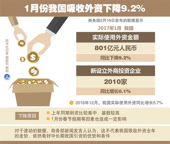 1月,我國(guó)實(shí)際使用外資金額801億元人民幣(折120億美元),同比下降9.2%。有人提出,這是否印證了“中國(guó)出現(xiàn)外資撤離潮”的說(shuō)法?對(duì)此,商務(wù)部部長(zhǎng)高虎城21日在國(guó)新辦發(fā)布會(huì)上給予了有力的反駁。