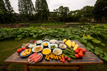 烏村恢復(fù)舊時農(nóng)家門前屋后有菜園的景象,大量的農(nóng)耕地種植了應(yīng)時的農(nóng)作物,在午餐時可品嘗烏村特色“一小時蔬菜”,菜肴從采摘到上菜僅需1小時,新鮮到無可挑剔。游玩時垂釣所得的野生塘魚還可在烏村廚房進行烹飪。