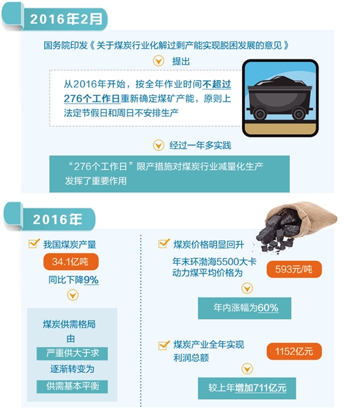 從實(shí)施效果看,這一措施達(dá)到了預(yù)期目標(biāo),使較長(zhǎng)時(shí)間處于寒冬的煤炭產(chǎn)業(yè)經(jīng)濟(jì)形勢(shì)出現(xiàn)逆轉(zhuǎn)。2016年,我國(guó)煤炭產(chǎn)量34.1億噸,同比下降9%,煤炭供需格局由嚴(yán)重供大于求逐漸轉(zhuǎn)變?yōu)楣┬杌酒胶?煤炭?jī)r(jià)格明顯回升,年末環(huán)渤海5500大卡動(dòng)力煤平均價(jià)格為593元/噸,年內(nèi)漲幅為60%;煤炭產(chǎn)業(yè)全年實(shí)現(xiàn)利潤(rùn)總額1152億元,較上年增加711億元。