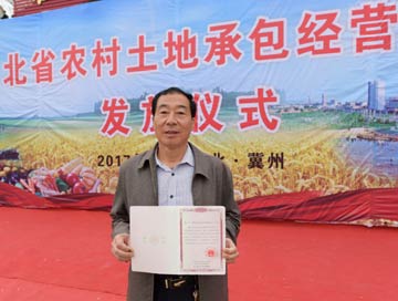 | 圖為衡水市冀州區(qū)莊子頭村村民魏九明在展示領(lǐng)到的《農(nóng)村土地承包經(jīng)營(yíng)權(quán)證》。新華社記者 王曉/攝? |