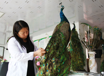 為了使更多的孔雀制品進入游客的后備箱,周家姐妹和合作社的加盟農(nóng)戶們商量著對孔雀產(chǎn)業(yè)進行深度開發(fā)。她們建立孔雀制品工作室,探索孔雀羽毛的多樣化制作,50根孔雀羽毛和3朵牡丹花搭配,做成“花開富貴”的插花,羽毛上繪上精美的圖案成為羽毛畫。合作社還張羅著給孔雀肉和孔雀蛋注冊商標,不僅可以銷售給前來旅游的人,還可以銷往各大超市。對于孔雀糞,合作社也不愿浪費,現(xiàn)在成了孔雀園里1000多株果樹的肥料。她們還計劃著開展攝影服務(wù),打造孔雀類主題婚紗攝影基地。