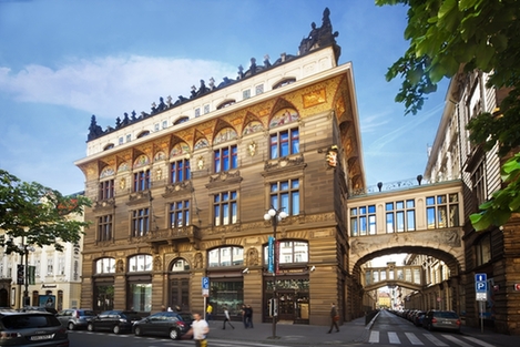 布拉格,護(hù)城河大街22號,一幢建于1896年的建筑看上去古老又滄桑,由于年代久遠(yuǎn),這幢新文藝復(fù)興主義風(fēng)格的大樓,外立面已微微發(fā)黑。引人注目的是,在兩面墻的交接處,一只戴著金色王冠的白色獅子傲然挺立,兩條尾巴交叉揚(yáng)起。