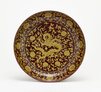 另一件拍品為明嘉靖紅地黃彩龍穿花紋盤,款識(shí)為“大明嘉靖年制”六字雙行楷書款。嘉靖彩瓷冠絕一時(shí),其彩畫之詭奇,繪事之偉麗,稱勝于明、清兩代,后世無(wú)人可及。其間發(fā)明甚多,諸種色釉相互交融,鋪陳出一個(gè)斑斕絢麗的彩瓷世界,其中紅地黃彩者最為名貴,“黃”為帝王用色,“紅”則表意幸運(yùn),兩種色彩相輔相成,表示“皇上洪福”之吉祥寓意,為嘉靖一朝所獨(dú)有,深得藏家所推崇。內(nèi)外滿施礬紅彩為地,以黃彩繪龍穿花紋為飾。花飾繁縟豐富,筆意瀟灑恣肆,龍紋古拙可愛(ài),雖無(wú)永樂(lè)、宣德盛世威武剛猛之氣,卻獨(dú)具詼詭古趣,為嘉靖、萬(wàn)歷時(shí)期特有之風(fēng)格。目前所見(jiàn)如本品紅地黃彩裝飾風(fēng)格的器皿主要都是云龍紋罐,穿花龍紋盤目前還僅此一例。本品所飾之紅彩色澤鮮妍,華麗凝重,雖然歷經(jīng)四百余年的風(fēng)霜,絲毫不減其風(fēng)韻,依然驚艷四方,動(dòng)人心魄。
