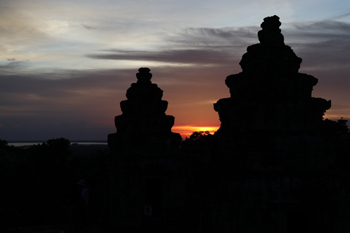 很多游客的吳哥之行從吳哥寺觀日出開始。天才蒙蒙亮,很多來看日出的游客已經(jīng)守在吳哥寺西面南北兩個“蓮花池”旁,其中不乏裝備齊全的專業(yè)攝影師。吳哥寺日出的魅力在于它的美變幻莫測,云層的變化令日出色彩絢爛,吳哥寺五座標(biāo)志性寶塔的剪影和朝霞映在蓮花池的水面,讓人分不清幻影還是真實(shí),這種穿越時(shí)空的美,攝人心魄。