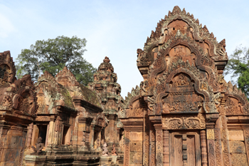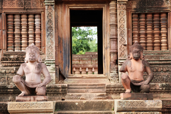 離開吳哥窟,驅(qū)車向北約40分鐘左右就到了女王宮。雖然俗稱女王宮,其實(shí)這也是一座寺廟,但是與其他寺廟不同,它是由砂巖建造而成,通體呈朱紅色。這里的建筑比其他寺廟低矮許多,從門框、門楣,到挑檐、基座都無比華麗,精致繁復(fù)的浮雕無處不在,用作家蔣勛的話來講:“幾乎是以紡織刺繡的工法在做石雕,令人嘆為觀止。”