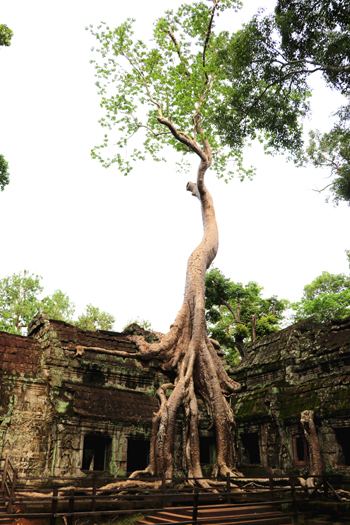 巴戎寺往東不遠(yuǎn)就是塔布隆寺,這座因好萊塢電影《古墓麗影》而名聲大噪的寺廟幾乎被叢林吞噬。廢棄數(shù)百年間,古樹早將神廟緊緊纏繞,樹的根莖穿繞在梁柱、屋檐、門窗之間,探入石縫,和廟宇融為一體,它們相互依靠,卻又彼此對抗。