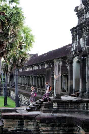 看過日出從西門進(jìn)入游覽,吳哥寺外圍回廊上的浮雕長達(dá)百米,人物眾多、雕刻生動,像徐徐展開的畫卷講述古老的史詩;寺廟里面殿堂互通,隨處可見肢體殘缺的佛像,有的整面墻都刻著神秘古老的文字,上午的日光透過石柱斜撒在雕刻上,那種顆粒感透著歷史的滄桑。仙女浮雕是寺里最常見的形象之一,她們頭飾華麗,形態(tài)各異,或端莊而立,或翩翩起舞。這些稱為阿普薩拉的仙女體態(tài)婀娜,笑不露齒,據(jù)說在吳哥寺上千個仙女像中,只有一個例外,如果有興趣,不妨細(xì)細(xì)找一找這位露齒微笑的仙女。