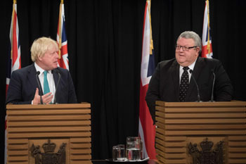 ??? 7月25日,在新西蘭惠靈頓,英國外交大臣鮑里斯·約翰遜(左)出席與新西蘭外交部長格里·布朗利共同舉行的新聞發(fā)布會(huì)。到訪新西蘭的約翰遜25日在惠靈頓表示,在英國退出歐盟后談判自由貿(mào)易協(xié)定的對象中,新西蘭“排在前列”。新華社/法新 |