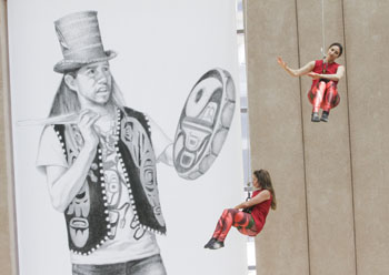 ??? 7月23日,在加拿大溫哥華,舞者們在溫哥華圖書館大樓外墻進(jìn)行空中舞表演。當(dāng)日,溫哥華Aeriosa舞蹈團(tuán)在溫哥華圖書館大樓進(jìn)行空中舞表演。舞者們被繩索懸掛在五層高的大樓上,把大樓外墻變成舞臺(tái),隨著音樂展現(xiàn)優(yōu)美的舞姿。新華社發(fā)(梁森 攝) |