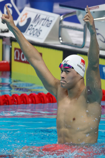??? 7月25日,在匈牙利布達(dá)佩斯進(jìn)行的第17屆國際泳聯(lián)游泳世錦賽男子200米自由泳決賽中,中國選手孫楊以1分44秒39的成績奪得冠軍。新華社發(fā)(弗爾季·奧蒂洛 攝) |