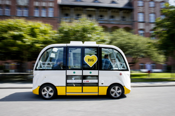 ??? 7月31日,在德國柏林,法國公司Navya制造的無人駕駛電動汽車行駛在柏林醫(yī)科大學內(nèi)。柏林公交公司計劃2018年在柏林醫(yī)科大學內(nèi)開通兩條無人駕駛電動汽車專線。新華社/歐新 |