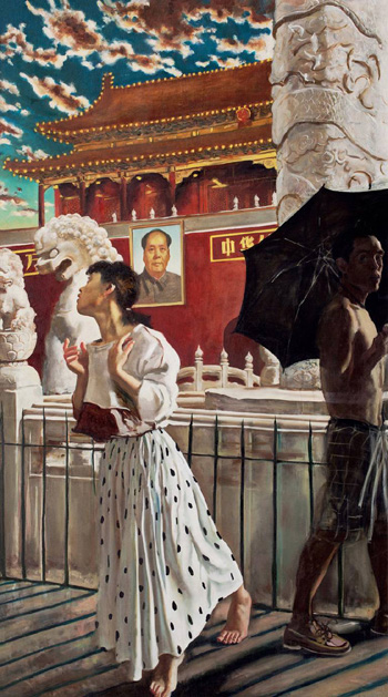 20世紀(jì)80年代至90年代早期,趙半狄從自己認(rèn)同的經(jīng)典藝術(shù)史中汲取營養(yǎng),從而發(fā)展出自身獨(dú)特的技巧。這些作品構(gòu)圖嚴(yán)謹(jǐn)、筆法克制,以敘事性的日常場景刻畫具體時(shí)空中普通人的存在與精神狀態(tài)。《蝴蝶》(1990年)、《遠(yuǎn)方來信》(1988年)、《涂口紅的女孩》(1987年)等作品將個(gè)體經(jīng)驗(yàn)與歷史元素獨(dú)特而鮮活地結(jié)合起來。1994年,在戴漢志策劃的展覽“月光號(hào)”上,趙半狄將數(shù)朵以10元人民幣疊成的“花”置于浸潤著血液的花瓶中的肋骨上,制造出甜膩誘人而殘酷可怖的消費(fèi)社會(huì)景觀(《一個(gè)童話》,1994年)。1996年起,趙半狄轉(zhuǎn)而運(yùn)用作為流行文化形式的廣告攝影與作為國家象征符號(hào)的可愛熊貓形象,巧妙地介入彼時(shí)方興未艾的社會(huì)狀況。他運(yùn)用具有宣傳與推廣作用的“熊貓”符號(hào)與視覺形式創(chuàng)作了一系列展示公益性內(nèi)容的燈箱,嘗試與藝術(shù)界之外的廣闊公共領(lǐng)域?qū)υ挘ā囤w半狄和熊貓》,1999年)。