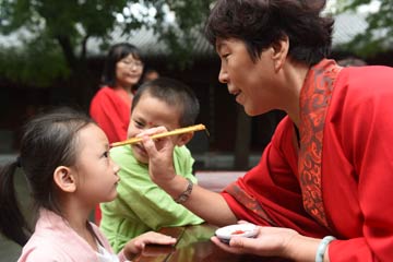 | 8月22日,一位老師在一名孩子的頭部點(diǎn)朱砂。 當(dāng)日,河北省滄州市運(yùn)河區(qū)文廟社區(qū)為轄區(qū)孩子舉行“開筆禮”,26名即將升入小學(xué)的孩子在老師和家長(zhǎng)帶領(lǐng)下,通過朱砂開智、擊鼓鳴志、開筆學(xué)字等環(huán)節(jié)感受中國(guó)傳統(tǒng)文化。新華社發(fā)(傅新春 攝)? |