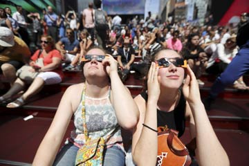 ?當(dāng)?shù)貢r(shí)間8月21日,一次罕見的日全食景觀橫貫美國(guó)大陸,這是1918年以來首次發(fā)生僅在美國(guó)可見且美國(guó)東西兩岸皆可觀測(cè)的日全食。除此之外,在全食帶兩側(cè)數(shù)千千米的區(qū)域內(nèi)都能觀測(cè)到食分不等的日偏食。圖為人們?cè)诿绹?guó)紐約時(shí)報(bào)廣場(chǎng)觀看日食。記者 王迎 攝 |