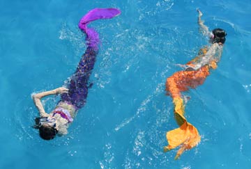 | 8月22日,重慶市氣象臺(tái)發(fā)布高溫紅色預(yù)警信號(hào)。重慶洋人街水上樂園邀請(qǐng)部分女游客穿上“魚尾泳裝”,在水中樂享清涼。記者 王全超 攝? |