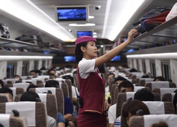 8月21日,一名工作人員在北京南至天津的“復(fù)興號(hào)”上幫顧客整理行李。自8月21日起,鐵路部門擴(kuò)大“復(fù)興號(hào)”動(dòng)車組列車開行范圍,京津城際列車開行19.5對(duì)“復(fù)興號(hào)”動(dòng)車組列車。記者 羅曉光 攝? |