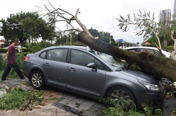 ?8月23日,珠海情侶路旁的一棵大樹被吹倒砸在汽車上。當(dāng)日12時(shí)50分左右,今年第13號(hào)臺(tái)風(fēng)“天鴿”(強(qiáng)臺(tái)風(fēng)級(jí))在廣東珠海南部沿海登陸,登陸時(shí)中心附近最大風(fēng)力有14級(jí)(45米/秒)。記者 盧漢欣 攝 |