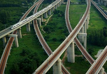 ? 以地處中原的鄭州為中心,鐵軌在大地上寫了一個(gè)“米”字,構(gòu)建起覆蓋逾7億人的兩小時(shí)高鐵網(wǎng),這樣宏偉的設(shè)想7年前還只是“紙上藍(lán)圖”,如今正在加速變?yōu)椤暗厣贤ㄍ尽薄D為一列動(dòng)車組列車從鄭州市區(qū)內(nèi)縱橫交錯(cuò)的高鐵線路中穿過(8月17日攝)。記者 李安 攝 |